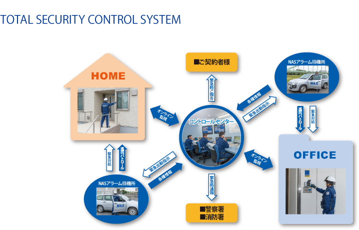 対象施設に、最適なセキュリティシステムを構築します。万一緊急事態が発生したときは、NASアラーム警備センターに通報され、緊急指令により担当警備が直ちに急行し適切な処置を行います。