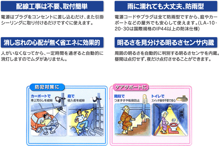 暗闇でパッと点灯する明るい光は防犯に効果的。