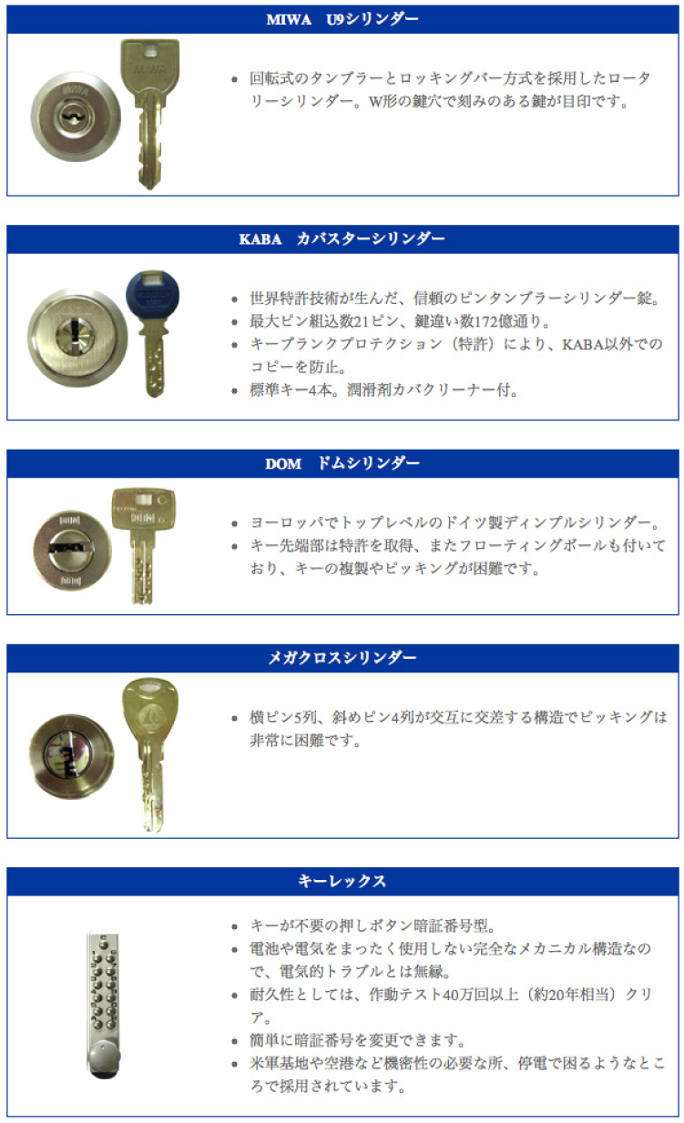 防犯性が高い鍵(ピッキング対策、カム送り対策、サムターン回し対策)への交換、